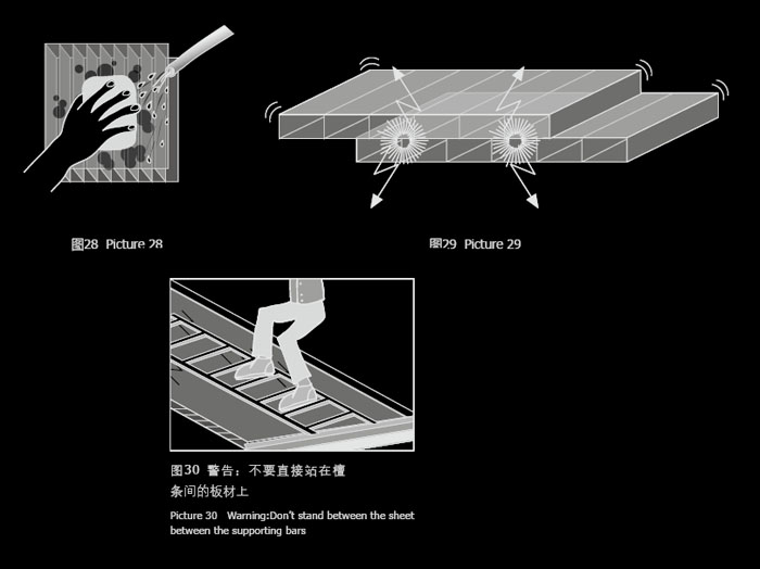 2. 不要站在檁條間或采光框架中間的板材上,如果需要,盡量站在有支撐骨架的地方,因為集中荷載導致的變形可能會使板材從型材中抽出。